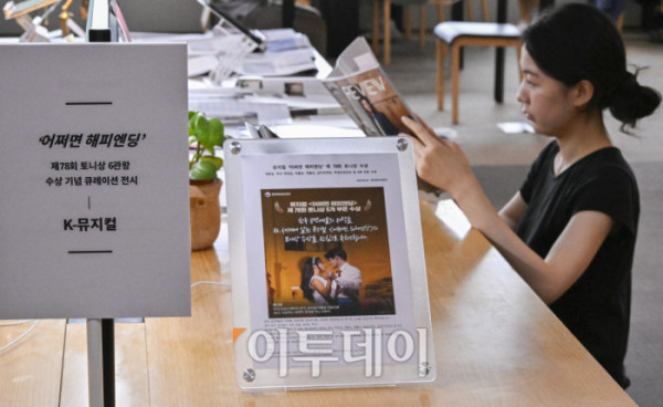 ▲20일 서울 서초구 국립중앙도서관 연속간행물실에 한국 창작 뮤지컬 '어쩌면 해피엔딩'의 미국 토니상 최초 6관왕 기념 K-뮤지컬 특별코너가 마련되어 있다. 국립중앙도서관이 한국 뮤지컬의 태동과 성장, 세계 무대에서의 가능성을 조명하기 위해 마련한 이번 코너는 작품에 관한 자료, 박찬휴 작가 과거 인터뷰, 토니상 시상식 영상 등을 전시한다. 조현호 기자 hyunho@