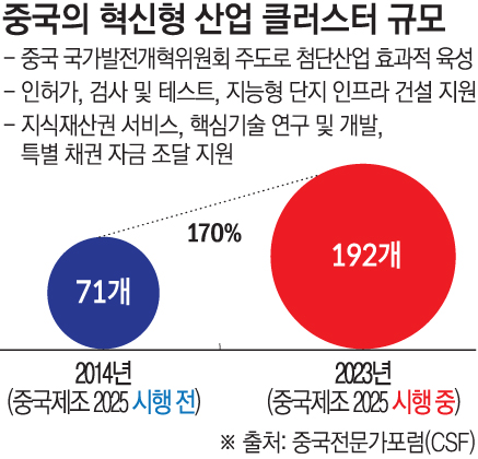 23일 중국전문가포럼(CSF)에 따르면 중국의 혁신형 산업 클러스터 규모는 제조업 활성화를 목표로 발표한 산업고도화 전략인 중국제조 2025 전후로 최근 10년간(2014~2023년) 170% 증가한 것으로 나타났다.