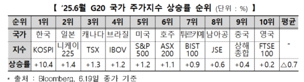한편, KOSPI는 대선일을 기점으로 연일 연고점을 경신 중으로, 6월 상승률(10.2%)은 G20 국가 중 1위를 기록 중이다. 연초로 시계열을 넓혀도 G20 국가 중 2위(24.1%)에 해당한다.
