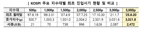 20일 한국거래소에 따르면 이날 코스피 지수는 종가 기준 3021.94로 장을 마쳤다. 2021년 12월 28일 이후 3년 6개월여 만에 3000선을 회복한 것으로, 시가총액도 2472조 원으로 역대 최고치를 경신했다.