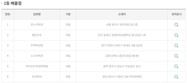 1등 배출점은 △온누리복권(서울 동작) △행운로또(부산 동래구) △주택복권방(경기 안양시) △노다지복권(강원 삼척시) △럭키로또복권판매점(충북 청주시)△돈보따리(경남 양산시) 등이다.