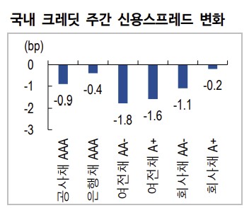 그러면서 "신용등급 하향에 대한 부분이 민평 금리에 반영되어 있기 때문"이라며 "신용등급 하락보다는 우호적인 수요예측 결과에 집중하면서 신용 스프레드는 축소세 이어갈 것"으로 전망했다.