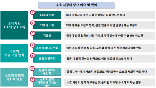 이커머스의 성장, 외식의 감소, 저출생과 고령화에 따른 수요 세대의 전환 등으로 소비 환경이 급격하게 변화함에 따라 소호 시장의 패러다임도 바뀌고 있다. 패러다임 변화에 적응하는 업체와 대응력이 미흡한 업체 간의 실적 차별화가 불가피한 상황이다.