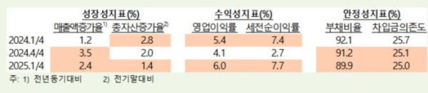 아울러 안정성 지표인 부채비율은 89.9%로 전분기(91.2%) 대비 하락했다. 차입금의존도도 같은 기간 0.1%p 하락해 25.0%를 기록했다.