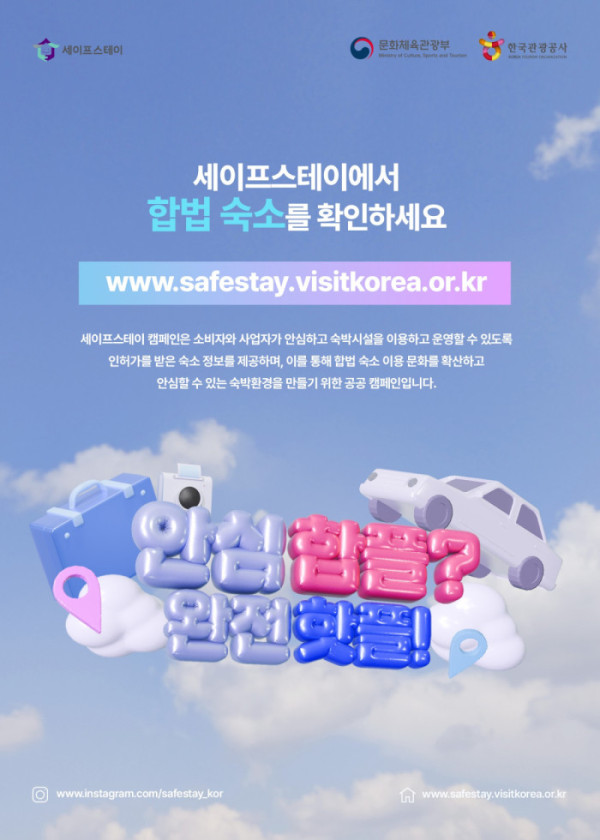 23일 문체부에 따르면, 세이프스테이는 합법 숙소 이용 문화를 확산하는 캠페인이다. 여행객들은 합법 민박 업소의 정보를 제공하는 세이프스테이 누리집(https://safestay.visitkorea.or.kr) 이용을 통해 안전한 여행을 즐길 수 있다.