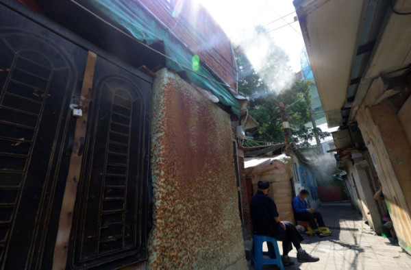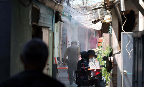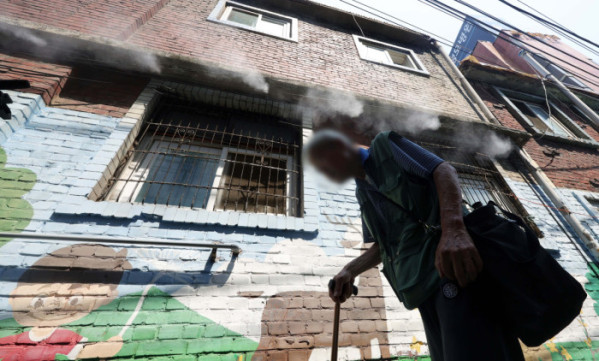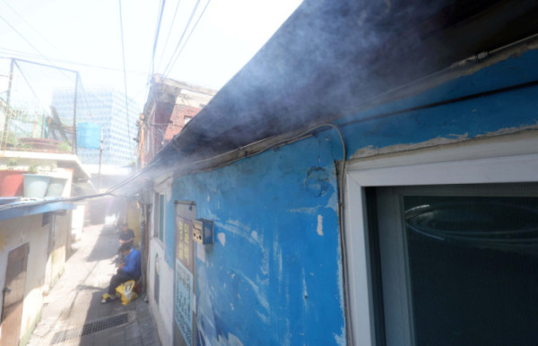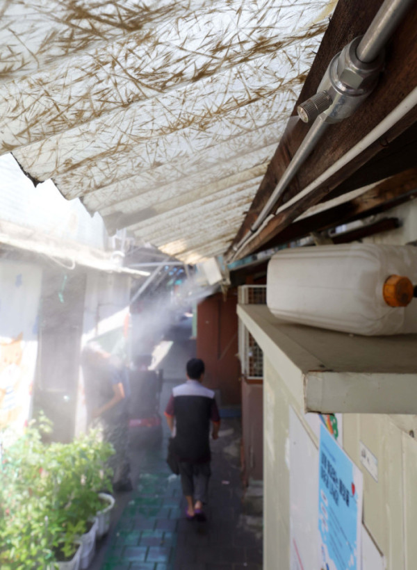 무더운 날씨, 쿨링포그 가동되는 쪽방촌 [포토]