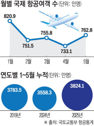 23일 국토교통부 항공통계에 따르면 올해 1~5월 국내·외 항공사의 누적 국제선 여객은 3824만0542명으로 나타났다. 이는 지난해 같은 기간 3558만3051명보다 7.47% 증가했고, 코로나19 전인 2019년(3783만4783명)보다도 늘어난 수치다.
