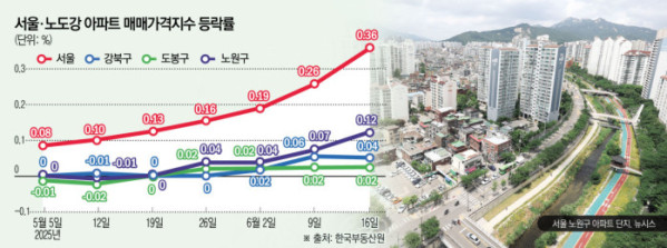 핵심지 집값이 가파른 상승세를 보이자 줄곧 지지부진했던 노원구와 도봉구, 강북구도 반등했다. 강북구는 이달 들어 3주 연속 올랐고 노원·도봉은 지난달 마지막 주부터 4주째 상승했다. 강북과 도봉은 주간 오름폭이 아직 소수점 두 자리지만 노원은 0.04%에서 0.12%까지 높아졌다.