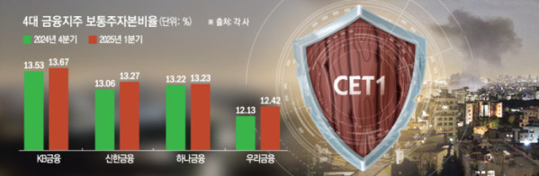 신한금융도 올해 CET1 목표를 13.1%로 설정하고 투자은행(IB) 부문의 셀다운 매각과 자산 유동화를 통해 자본비율을 방어 중이다. 하나금융은 질적 성장 중심의 포트폴리오 운용을 통해 CET1을 13%대에서 안정적으로 유지할 계획이다. 우리금융은 유휴 부동산 매각 등 비핵심 자산 유동화를 통해 올해 12.5% 유지 및 2027년 13% 달성을 중장기 목표로 제시하고 있다.