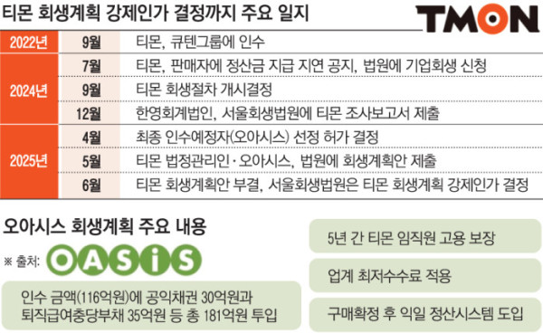 티몬의 오아시스 인수합병(M&A) 과정은 반전의 반전을 거듭했다. 4월 오아시스가 티몬의 최종 인수예정자로 선정됐을 당시 티몬 임직원의 고용을 5년 간 보장을 약속했으나, 이후 직후 직무 전환과 희망퇴직 시행에 나서며 논란에 휩싸였다. 또 1% 미만의 낮은 변제율 탓에 채권단 동의 여부를 놓고도 가결 가능성이 엇갈렸다. 20일 열린 관계인집회에서 회생채권자인 중소상공인 및 소비자에게서 3분의 2 동의를 얻지 못해 최종 티몬의 회생계획안은 부결됐다. 다만 재판부는 관리인이 요청한 강제인가결정을 받아들이면서 최종적으로 오아시스가 티몬을 인수하게 됐다.