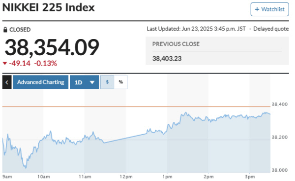 일본증시 닛케이225지수는 전 거래일 대비 49.14포인트(0.13%) 하락한 3만8354.09에, 토픽스지수는 10.08포인트(0.36%) 내린 2761.18에 마감했다.