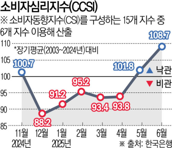 24일 한국은행이 발표한 ‘2025년 6월 소비자동향조사 결과’에 따르면 이달 소비자심리지수(CCSI)는 108.7로 전월 대비 6.9포인트(p) 상승했다. 2021년 6월(111.1) 이후 4년 만에 최고치다.