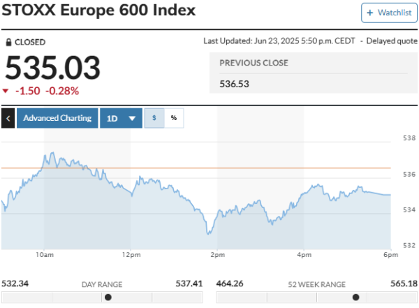 유럽증시는 23일(현지시간) 미국이 이란의 핵 시설을 공격한 데 따른 이란의 보복 위협에 투자자들이 불안해하면서 하락했다.