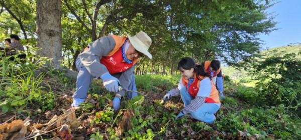 ▲최두환 SK피아이씨글로벌 대표(왼쪽)가 구성원들과 함께 외래 식물 제거 활동을 하고 있다. (사진= SKC)