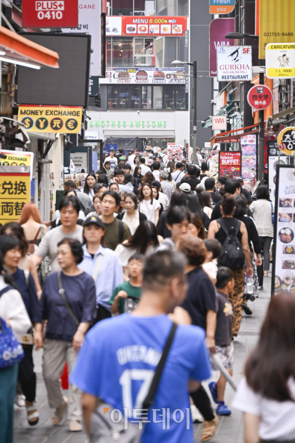 ▲새 정부 출범과 2차 추가경정예산(추경) 효과 등에 대한 기대로 소비자심리지수가 석 달 연속 상승했다. 한국은행이 24일 발표한 ‘소비자동향조사’ 결과에 따르면 6월 소비자심리지수(CCSI)는 108.7로 5월(101.8)보다 6.9포인트 올랐다. 지수는 지난해 12월 비상계엄으로 12.5포인트 급락한 뒤 오르내리다가 4월(93.8)과 5월(101.8)에 이어 6월까지 석달째 상승세를 이어갔다. 절대 수준도 2021년 6월(111.1) 이후 4년 만에 가장 높다. 이날 서울 중구 명동 거리가 점심시간을 맞아 거리로 나온 시민들로 북적이고 있다. 조현호 기자 hyunho@