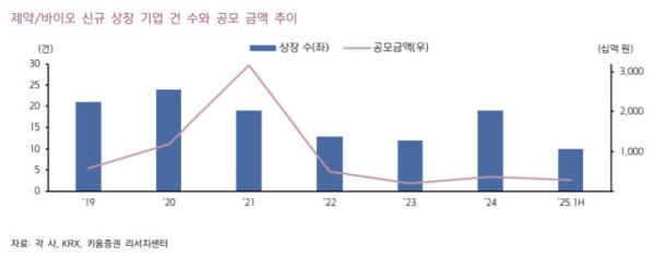 국내 제약·바이오 기업들의 신규 상장 건수는 2023년 12건으로 가장 낮았고, 2024년 19건, 올해 상반기 10건을 기록했다. 공모 금액으로는 2023년 연간을 넘어선 수준이다.
