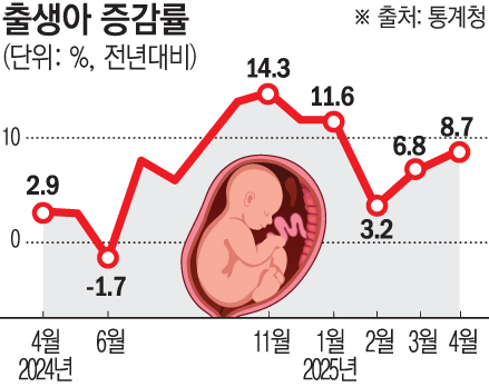 올해 4월 출생아 수가 1년 전보다 8.7% 늘어나면서 같은 달 기준으로 1991년 이후 34년 만에 최대 폭 증가했다. 혼인 건수도 6년 만에 최대치를 기록했다. 주요 출산 연령층인 30대 초반 여성 인구가 늘어난 데다 혼인·출산에 대한 인식 개선 영향이라는 평가다.