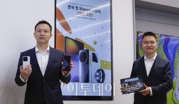▲앤드류 리(오른쪽) 샤오미 동아시아 총괄과 조니 우 샤오미코리아 지사장이 25일 서울 영등포구 샤오미 스토어 IFC몰 여의도점에서 열린 첫 공식 오프라인 매장 사전 공개행사에서 제품을 소개하고 있다. 샤오미코리아는 28일 여의도 IFC몰 L2층에 첫 공식 오프라인 스토어를 오픈한다. 매장은 약 60평 규모로, 실제 생활 공간을 재현한 체험형 쇼룸 형태로 설계돼 스마트폰, 태블릿, 스마트 워치 등 전 카테고리를 체험할 수 있다. 조현호 기자 hyunho@