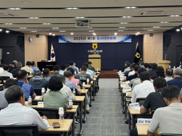 ▲장주익 조합장을 비롯한 임직원 120여 명이 참석한 가운데 본점 회의실에서 '2025년 제1회 임시대의원회'가 진행되고 있다. (수원축협)