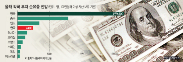 한국은 자산이 떠나는 대표적인 아시아 국가 중 한 곳으로 꼽혔다. 한국의 경우 경제와 정치적 격변기를 겪으면서 올해 2400명의 고액자산가가 순유출될 것으로 전망된다. 이는 지난해보다 유출 규모가 두 배 이상 많아진 것이다.