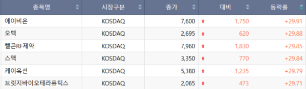 이날 코스닥 시장에서는 에이비온, 오텍, 텔콘RF제약, 스맥, 케이옥션, 브릿지바이오테라퓨틱스 등 6종목이 상한가를 기록했다.