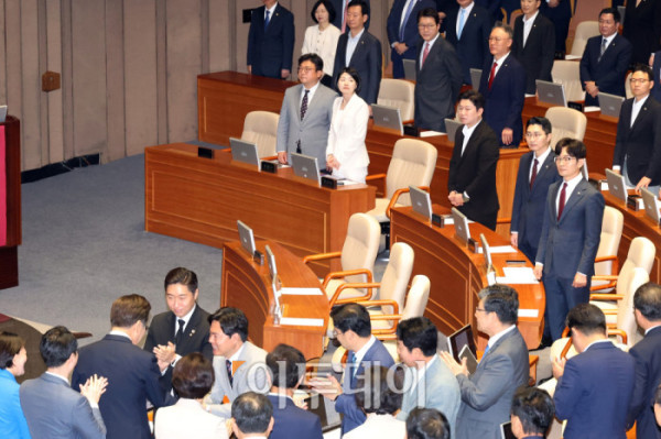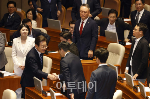 ▲이재명 대통령이 26일 서울 여의도 국회 본회의에서 2025년도 제2회 추가경정예산안에 대한 시정연설을 마치고 국민의힘 의원들과 인사하고 있다. 고이란 기자 photoeran@