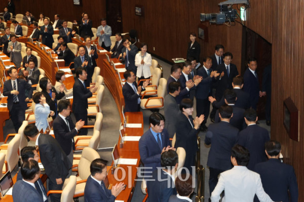 ▲이재명 대통령이 26일 서울 여의도 국회 본회의에서 2025년도 제2회 추가경정예산안에 대한 시정연설을 마치고 더불어민주당 의원들의 박수를 받으며 퇴장하고 있다. 고이란 기자 photoeran@