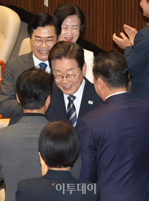 ▲이재명 대통령이 26일 서울 여의도 국회 본회의에서 2025년도 제2회 추가경정예산안에 대한 시정연설을 마치고 더불어민주당 의원들의 박수를 받으며 인사하고 있다. 고이란 기자 photoeran@