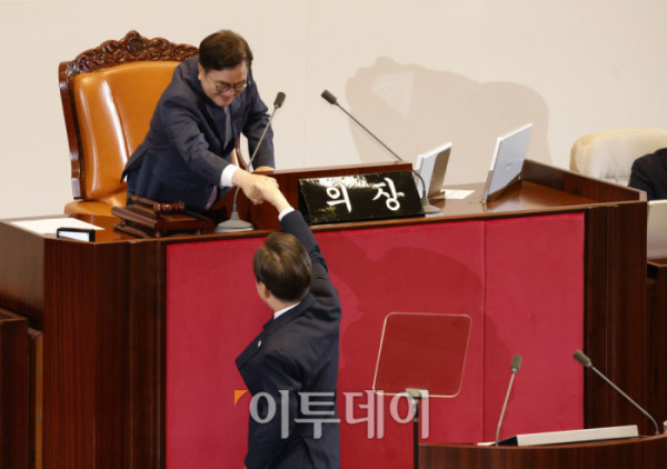 ▲이재명 대통령이 26일 서울 여의도 국회 본회의에서 2025년도 제2회 추가경정예산안에 대한 시정연설을 마치고 우원식 국회의장과 악수하고 있다. 고이란 기자 photoeran@