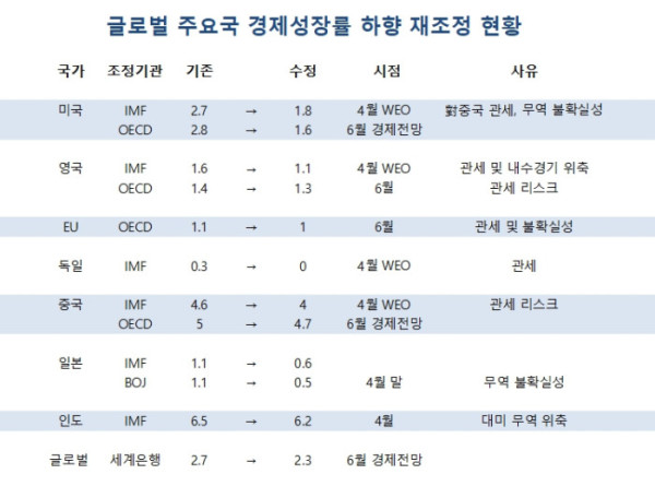 하반기를 앞두고 글로벌 주요국이 올해 경제성장률 전망치를 일제히 하향 재조정했다. 미국발 관세 리스크에서 시작한 주요국의 보호무역주의와 이에 따른 무역 불확실성이 주된 배경으로 꼽힌다.