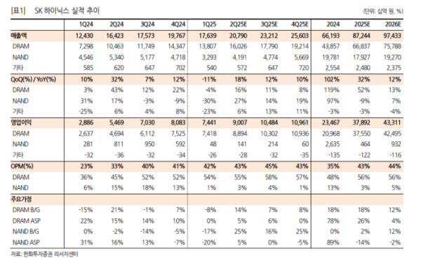 김 연구원은 “고대역폭메모리(HBM)3E 12단 매출의 본격적 확대가 핵심”이라며 “GB300향 공급이 본격화하며 전체 HBM 내 3E 12단 제품 출하 비중은 50%를 넘어섰을 것으로 추정한다”고 분석했다.