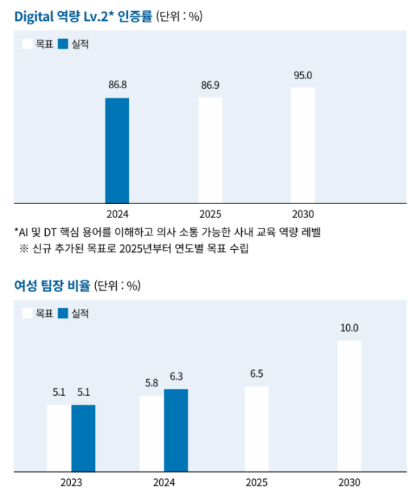 디지털 전환에 대응한 내부 인재 역량 강화 노력도 꾸준하다. 사내 구성원의 AI 및 데이터 리터러시 수준을 평가하는 ‘디지털 역량 Lv.2 인증제’를 통해 2024년 기준 86.8%의 인증률을 달성했다. 구성원 10명 중 9명 가까이가 일정 수준 이상의 AI 활용 역량을 갖춘 셈이다. 이 비율은 올해 86.9%, 2030년까지는 95% 달성을 목표로 하고 있다.