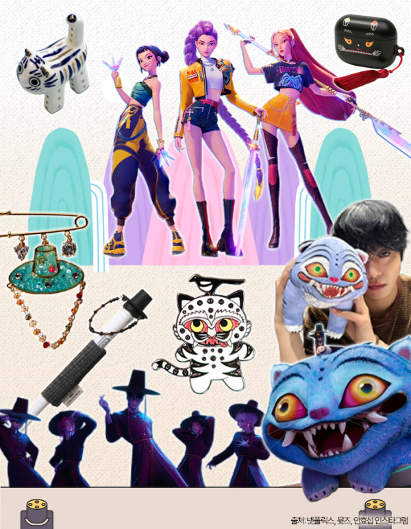 캐릭터들도 마찬가지입니다. 주인공인 헌트릭스, 매력적인 빌런 '진우'를 포함한 사자 보이즈 멤버들만큼이나 큰 인기를 끄는 더피와 서씨 듀오는 우리나라의 대표적인 민화 작호도(호작도)를 떠올리게 하죠.