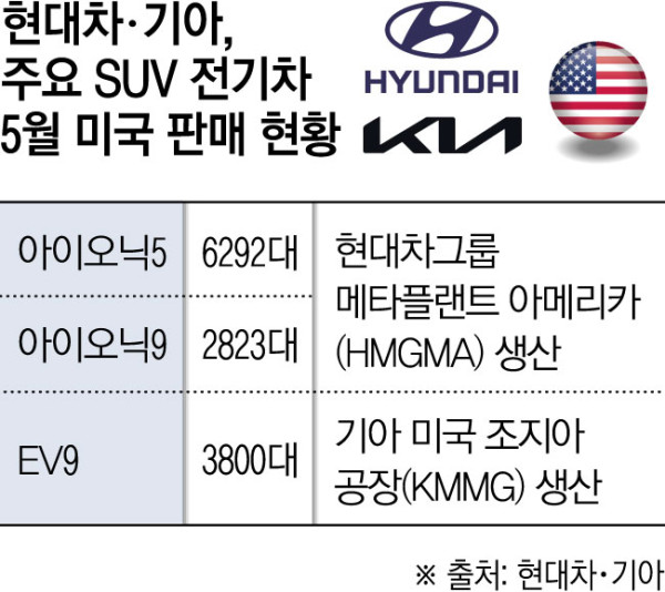 현대차그룹은 미국 내 현지 생산 본격화로 대형 SUV 판매도 확대하고 있다. 올해 초 가동한 현대차그룹 메타플랜트 아메리카(HMGMA)는 아이오닉 5에 이어 최근 아이오닉 9의 생산을 시작했다. HMGMA에서 생산된 아이오닉 5는 4월 현지 시장에서 8076대를, 5월 6292대를 판매했다. 지난달부터 판매에 돌입한 아이오닉9은 2823대를 기록했다.
