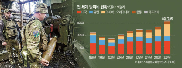 대륙별로는 유럽에서의 지출이 17% 증가한 6930억 달러를 기록해 가장 많았다. 우크라이나 전쟁이 3년째 이어지면서 유럽 방위비는 냉전 종식 당시 수준을 넘어섰다. 전쟁 당사자인 러시아와 우크라이나를 비롯해 독일과 폴란드 등 주요국 지출이 눈에 띄게 늘었다.