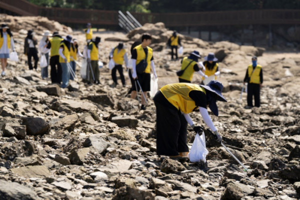 ▲6월 26일 인스파이어 임직원 봉사단이 신도 선착장 주변 해양 쓰레기를 수거하고 있다. (사진제공=웨버샌드윅)