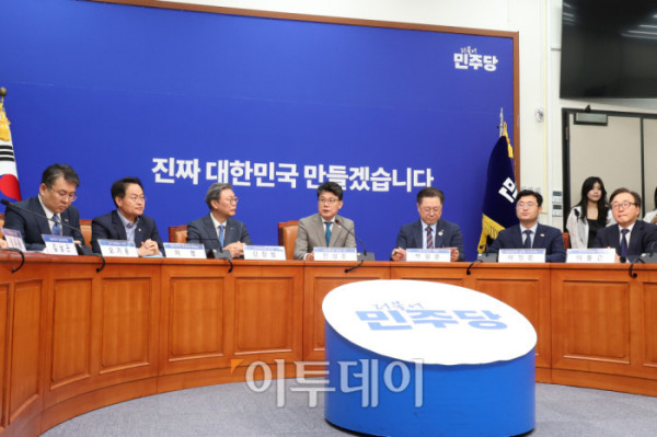 ▲진성준 더불어민주당 정책위의장이 30일 서울 여의도 국회에서 열린 민주당-경제단체 상법 간담회에서 발언을 하고 있다. 왼쪽부터 오기웅 중소기업중앙회 부회장, 허영 원내정책수석부대표, 김창범 한국경제인협회 부회장, 진 정책위의장, 박일준 대한상공회의소 부회장, 이정문 정책위 수석부의장, 이동근 한국경영자총협회 부회장. 고이란 기자 photoeran@