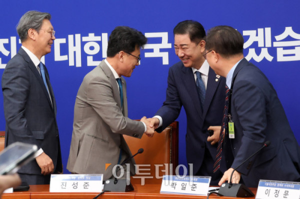 ▲김병기 더불어민주당 대표 직무대행 겸 원내대표가 30일 서울 여의도 국회에서 열린 민주당-경제단체 상법 간담회에 예고없이 방문해 참석자들과 인사하고 있다. 왼쪽부터 김창범 한국경제인협회 부회장, 진성준 정책위의장, 김 원내대표, 박일준 대한상공회의소 부회장. 고이란 기자 photoeran@