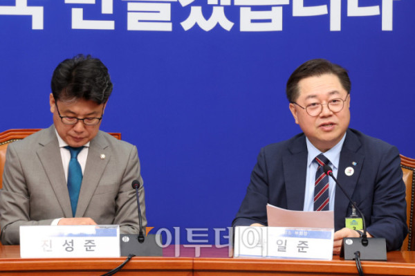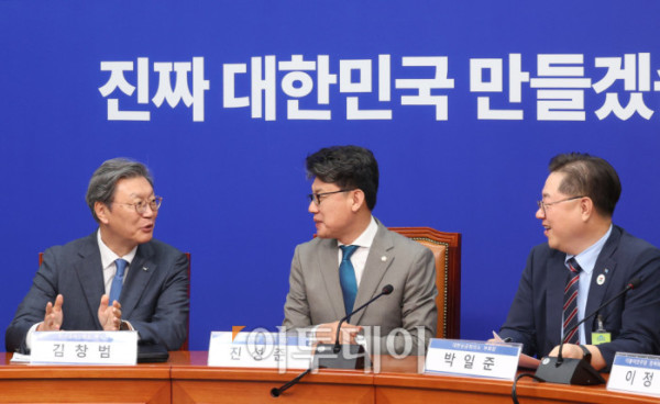 ▲진성준 더불어민주당 정책위의장이 30일 서울 여의도 국회에서 열린 민주당-경제단체 상법 간담회에서 발언을 하고 있다. 왼쪽부터 김창범 한국경제인협회 부회장, 진 정책위의장, 박일준 대한상공회의소 부회장. 고이란 기자 photoeran@