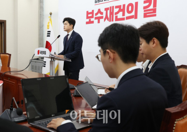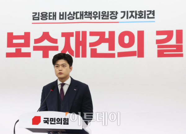 ▲김용태 국민의힘 비상대책위원장이 30일 서울 여의도 국회에서 '보수재건의 길'을 주제로 퇴임 기자회견을 하고 있다. 고이란 기자 photoeran@