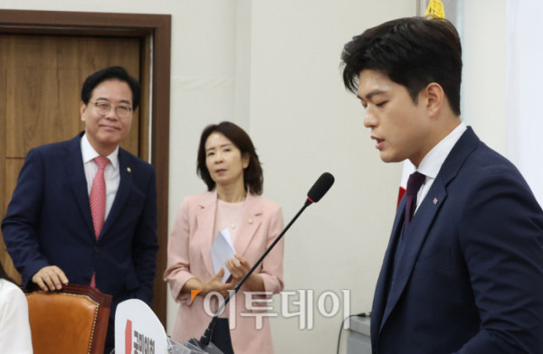 ▲김용태 국민의힘 비상대책위원장이 30일 서울 여의도 국회에서 '보수재건의 길'을 주제로 열린 퇴임 기자회견에서 인사하고 있다. 고이란 기자 photoeran@
