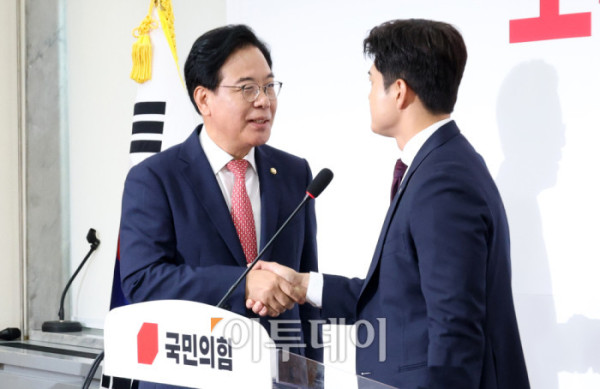 ▲김용태(오른쪽) 국민의힘 비상대책위원장이 30일 서울 여의도 국회에서 '보수재건의 길'을 주제로 열린 퇴임 기자회견에서 송언석 원내대표와 인사하고 있다. 고이란 기자 photoeran@