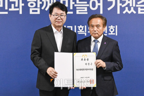 ▲이한주 국정기획위원회 위원장이 30일 서울 종로구 국정기획위원회에서 열린 임명·위촉장 수여식에서 윤창렬 국정기획위원회 부위원장에게 임명장을 수여하고 있다. 조현호 기자 hyunho@