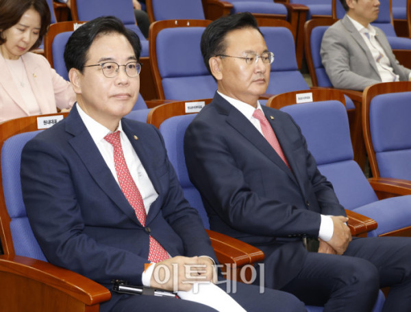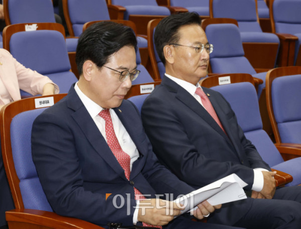 ▲송언석(왼쪽 두번째) 국민의힘 원내대표와 유상범(오른쪽 두번째) 원내수석부대표가 30일 서울 여의도 국회에서 열린 의원총회에 참석하고 있다. 고이란 기자 photoeran@