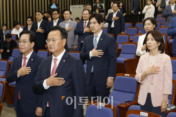 ▲송언석(앞줄 왼쪽) 국민의힘 원내대표가 30일 서울 여의도 국회에서 열린 의원총회에서 유상범(앞줄 왼쪽 두번째) 원내수석부대표를 비롯한 참석자들과 국민의례를 하고 있다. 고이란 기자 photoeran@