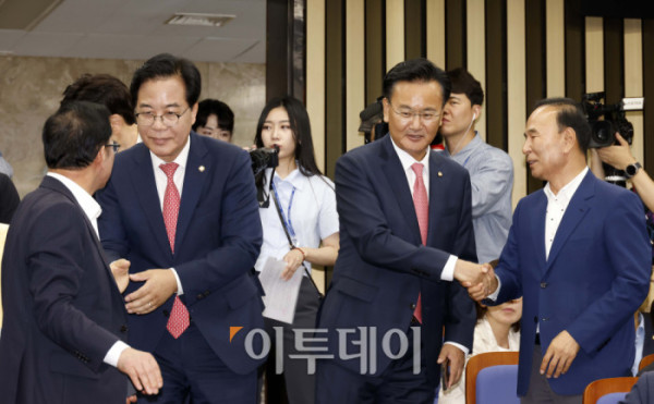 ▲송언석(오른쪽) 국민의힘 원내대표와 안철수 의원이 30일 서울 여의도 국회에서 열린 의원총회에서 악수하고 있다. 고이란 기자 photoeran@