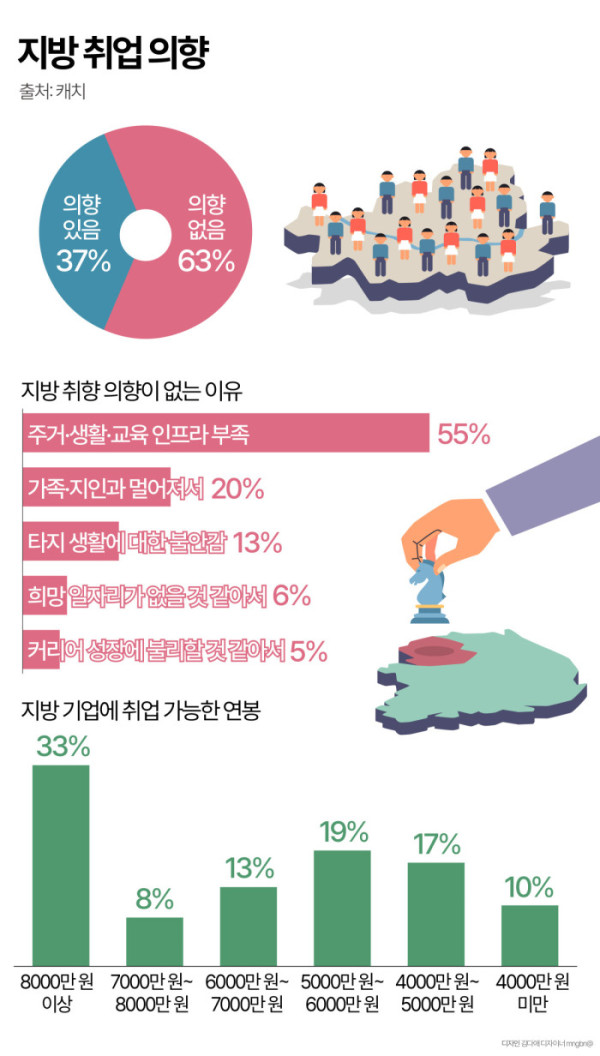 채용 플랫폼 캐치가 구직자 2754명을 대상으로 지난달 20일부터 30일까지 '지방 취업 의향'에 대한 설문조사를 한 결과 63%가 '지방에 있는 기업에 취업할 의향이 없다'고 답했다.