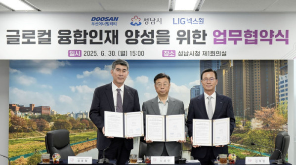 두산에너빌리티는 성남시청에서 성남시, LIG넥스원과 ‘글로컬 융합인재 양성 업무협약(MOU)’을 체결했다고 30일 밝혔다. 협약식에는 신상진 성남시장, 김동철 두산에너빌리티 관리부문장, 신익현 LIG넥스원 대표이사 등 주요 관계자들이 참석했다.