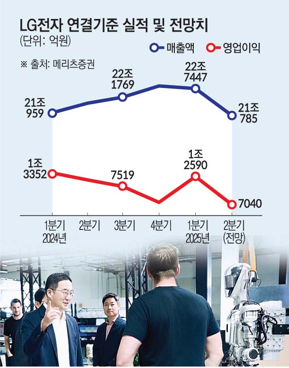 메리츠증권은 LG전자가 2분기 연결 기준으로 매출 21조785억 원, 영업이익 7040억 원을 기록할 것으로 예상했다. 이는 전년 동기 대비 각각 2.8%, 41.2% 감소한 수치로, 외형은 크게 줄지 않았지만, 수익성 측면에서 아쉬움이 크다는 평가다. 양승수 메리츠증권 연구원은 “LG전자 사업 구조상 하반기 계절적 비수기의 영향을 피해갈 수는 없다”며 “올해는 관세로 인한 비용 부담까지 더해지기 때문에 감익은 당연하다”고 분석했다.