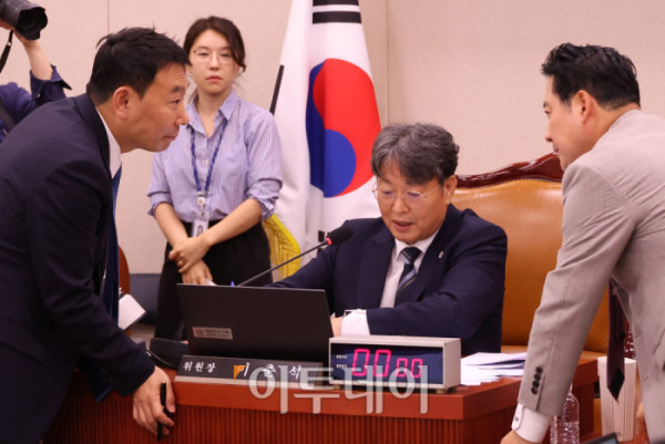 ▲1일 서울 여의도 국회에서 열린 법제사법위원회 전체회의에서 더불어민주당 소속 이춘석(가운데) 위원장이 여당 간사인 김용민(왼쪽) 더불어민주당 의원, 야당 간사인 장동혁 국민의힘 의원과 대화하고 있다. 고이란 기자 photoeran@